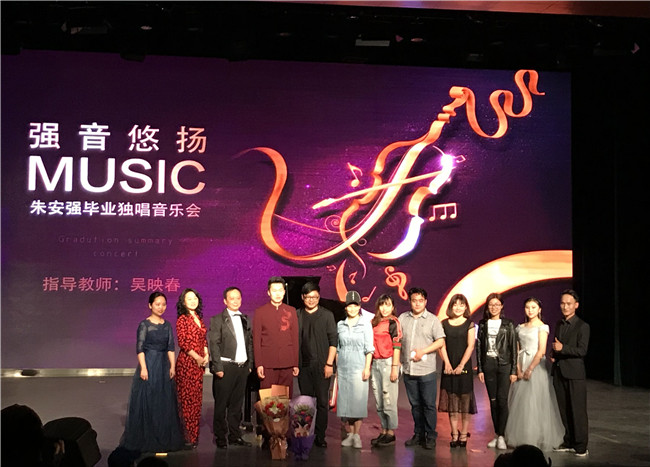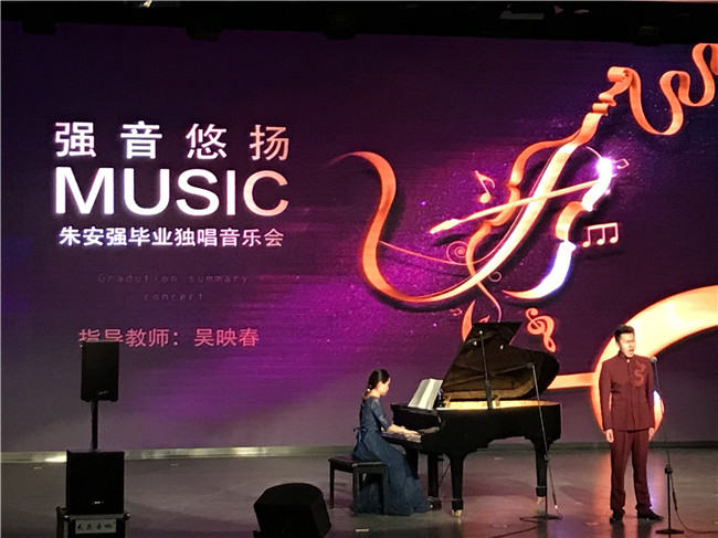 4月10日晚,2014级声乐表演专业员工朱安强在实训大楼多功能厅举办“强音悠扬”个人独唱毕业音乐会。学院领导、部分师生以及朱安强的亲友到场聆听。