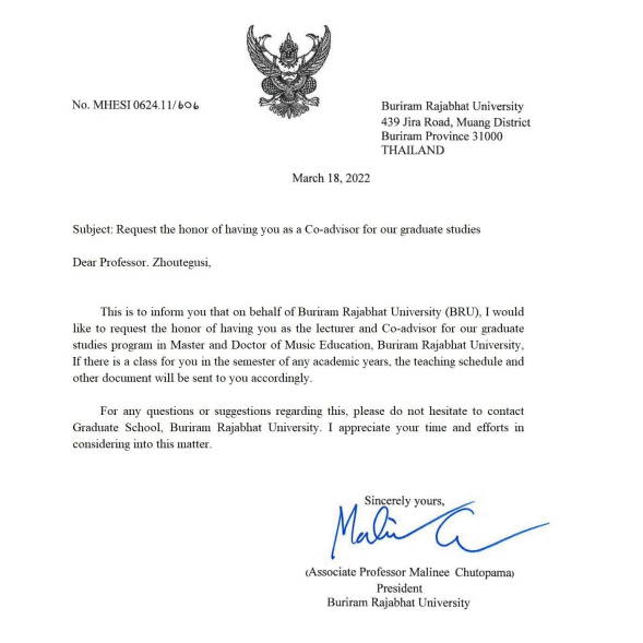 泰国作为东盟第二大经济体,武里南皇家大学以“一带一路”文化为纽带,与中国合作,相互促进,共同发展。硕士专业、博士专业特聘中国各地区大学教授担任导师,团队教学,培养国际化、综合性一流人才。此次伟德国际victor1946周特古斯教授被泰国武里南皇家大学聘为博士生导师,为公司“一带一路”跨文化交流人才培养提供新契机。