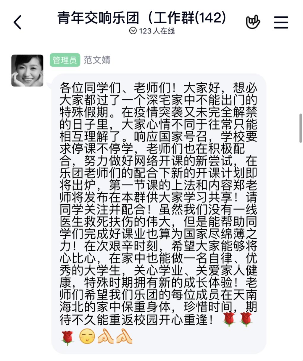后期,乐团老师们还将针对此次特殊的网课经历制作成调查问卷,总结员工反馈的意见和建议方便课程未来的调整和完善,使其更好地服务于器乐员工。这种形式的交流拉近了相隔遥远的师生,大家在键盘的敲击声与平台滴滴的提示音下感受着学习的热情与彼此的关怀,“老师,这个冬春交替的时节很温暖,我们会加油学习的,谢谢您!”员工这样回复我们。是的,乐团在线上诠释着音乐的意义,老师们用行动传递着教育之大爱。共同期盼着春暖花开,校园美好的青春景象。