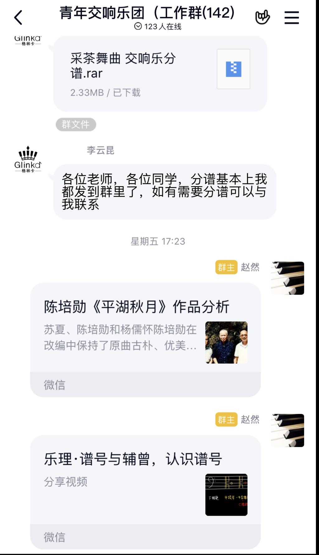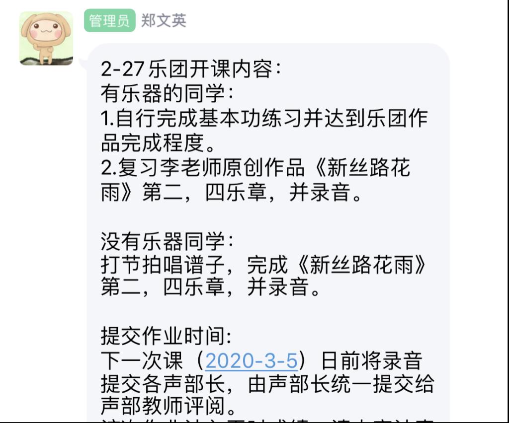 乐团教师们首先是在开课前期关心每位同学的健康状况,耐心询问网课学习是否存在困难。利用原有课程QQ工作群发布了开课公告,召集所有课程员工积极响应政策,克服困难,使用互联网加群学习课程。在确认了多数员工学习无障碍后,开始在教学平台上年发布练习乐谱作为学习资料供员工学习使用。收到乐谱后,员工在课程规定的时间段进行“打卡”上课(例如:每周合奏课为每周四15:15—18:00开课时间不变),直至课程结束。特殊时期教师们采取分流教学举措,安排了每位教师对本专业员工的网络学习监管工作。建立各自工作室、微信群、QQ群发布学习公告,督促员工录制音频、视频进行器乐演奏并耐心讲解答疑。这种授课方式也被教师们称为“分排”。一次课的考勤仍旧交给在乐团最有担当的员工乐务来完成。培养员工乐务与声部长一直是乐团的老传统,意在鼓励更多员工参与艺术团管理事务、锻炼组织能力,调动乐团所有力量共渡难关。