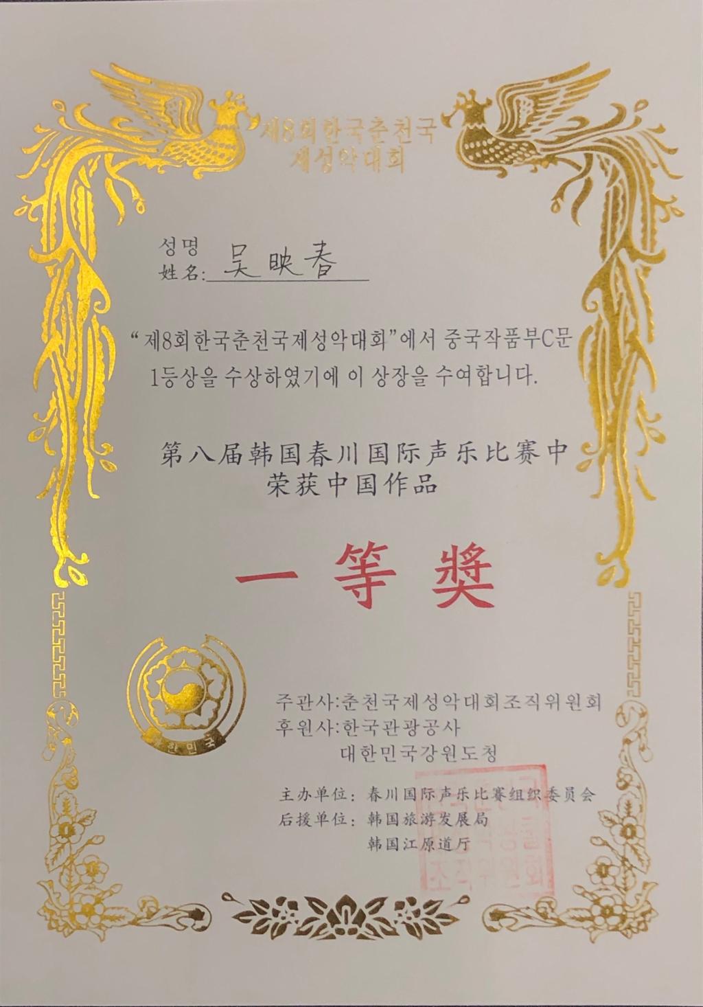 这次赛事有来自世界各地500余名员工、教师、演员以及青年歌唱家参加。经过初赛、复赛、决赛的激烈角逐,伟德国际victor1946吴映春老师凭借扎实的演唱功底,自然明亮的嗓音,优秀的音乐素养,赢得了评委会和观众的热烈掌声和高度赞赏,最终获得“韩国春川国际声乐比赛”第一名。