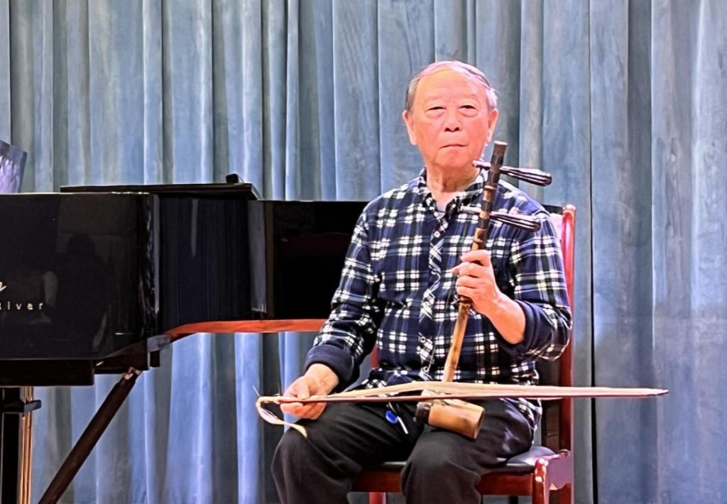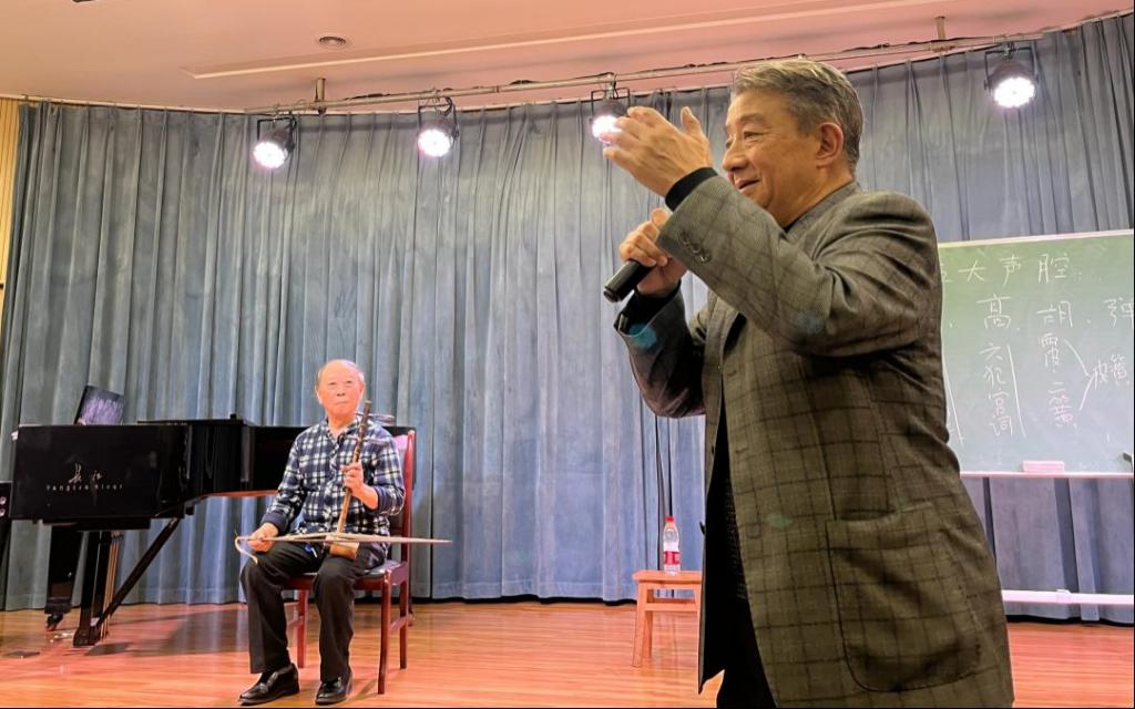 下午三点,讲座正式开始。在两个多小时的讲座过程中,刘五元先生详细讲述了川剧音乐的由来、曲牌的起源、声腔与方言的关系,并用高胡与京胡亲自示范了川剧五大声腔昆、高、胡、弹、灯的代表性曲牌旋律,同时介绍了嘉阳河川剧的独特性,还剖析了谢平安先生在川剧音乐上的独创性。