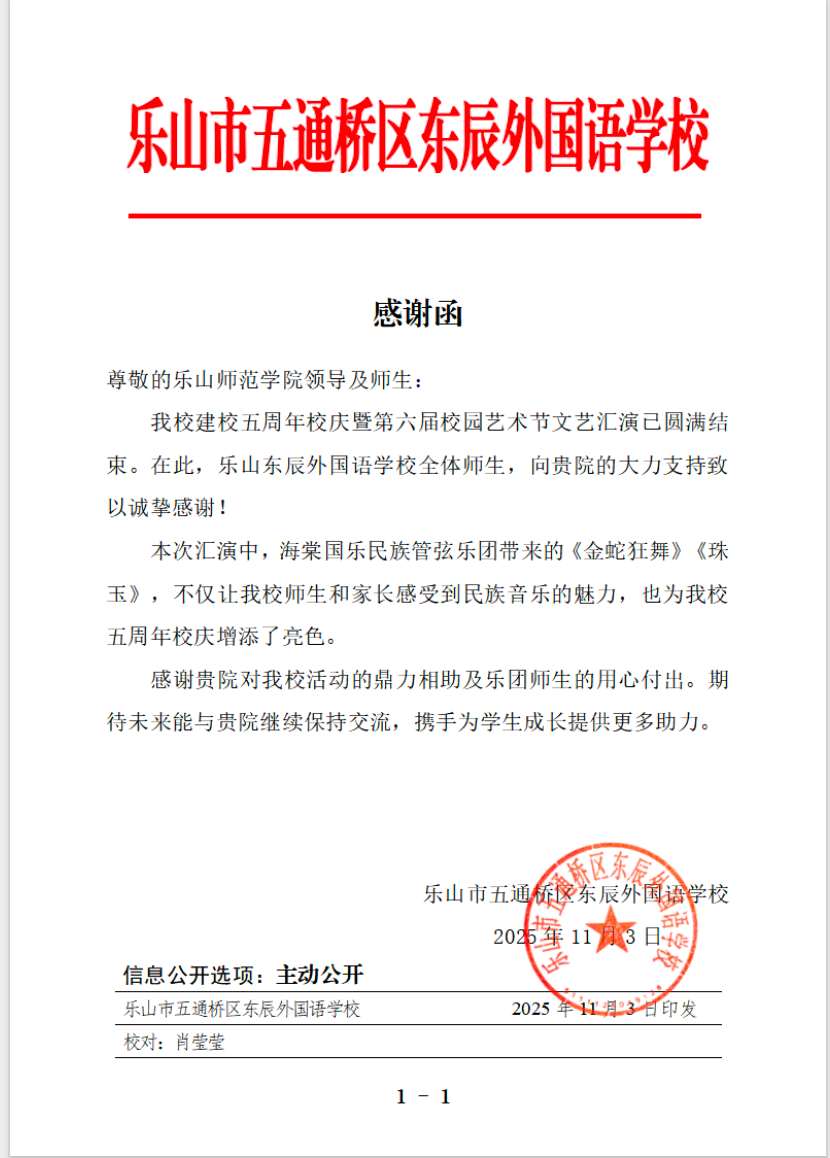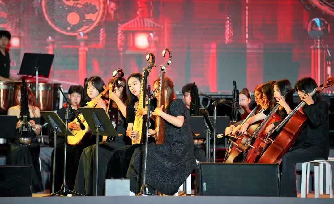 本网讯(文/赵若希图/东辰外国语学校 审核/吴映春)11月2日,伟德国际victor1946闰律海棠国乐民族管弦乐团受邀参加乐山东辰外国语学校第六届艺术节全校文艺汇演,以《金蛇狂舞》《珠玉》两首经典国乐作品作为开场曲目,用悠扬旋律拉开这场艺术盛宴的帷幕,践行高校美育浸润基础教育的使命担当。